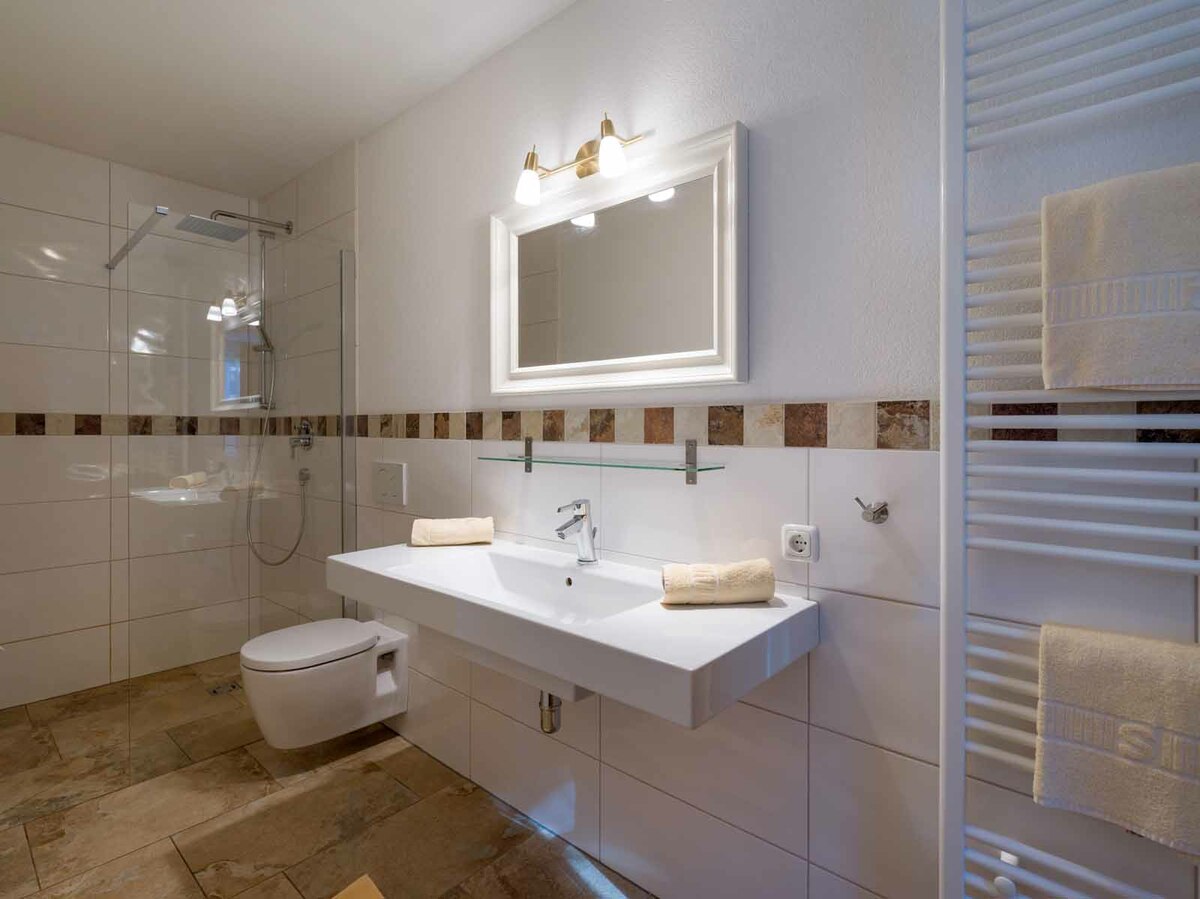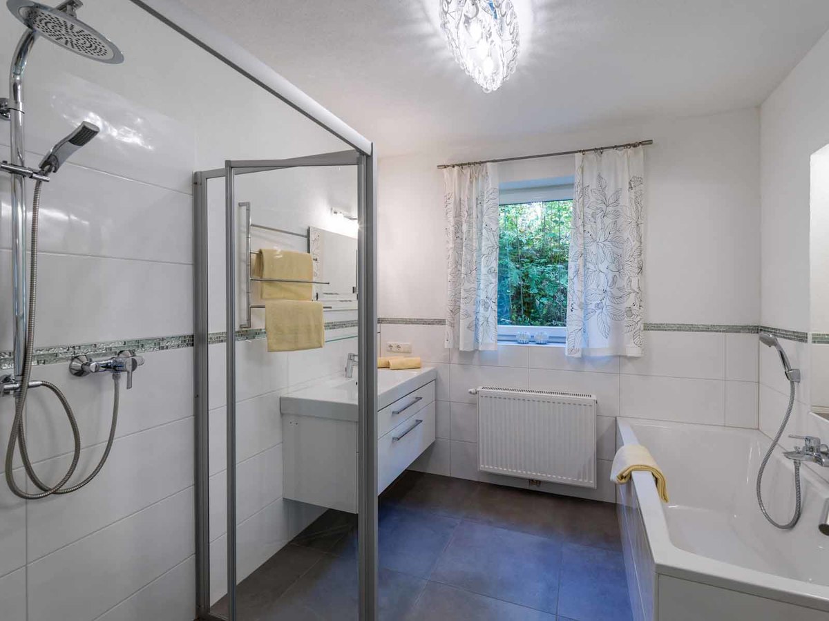 Ein Badezimmer mit Badewanne, Dusche, Doppelwaschbecken und WC sowie ein weiteres Badezimmer mit Dusche und WC, eine geräumige Küche mit Cerankochfeld, Spülmaschine, Filter-Kaffeemaschine, Nespresso-Kaffeemaschine, Backofen, Kühlschrank mit Gefrierfach und Eßtisch, so wie einem Wohnschlafraum  und rustikaler Essecke vollenden die gemütliche Wohnatmosphäre.