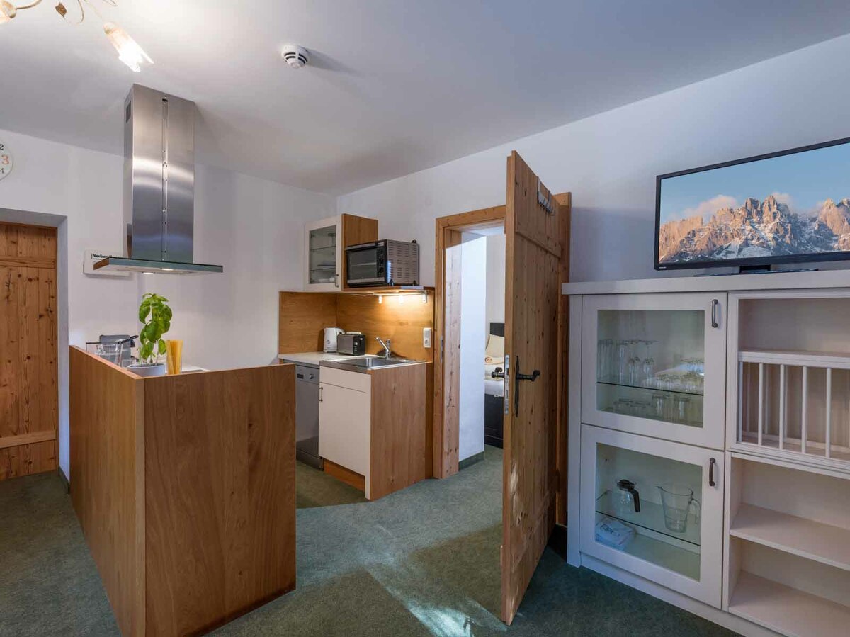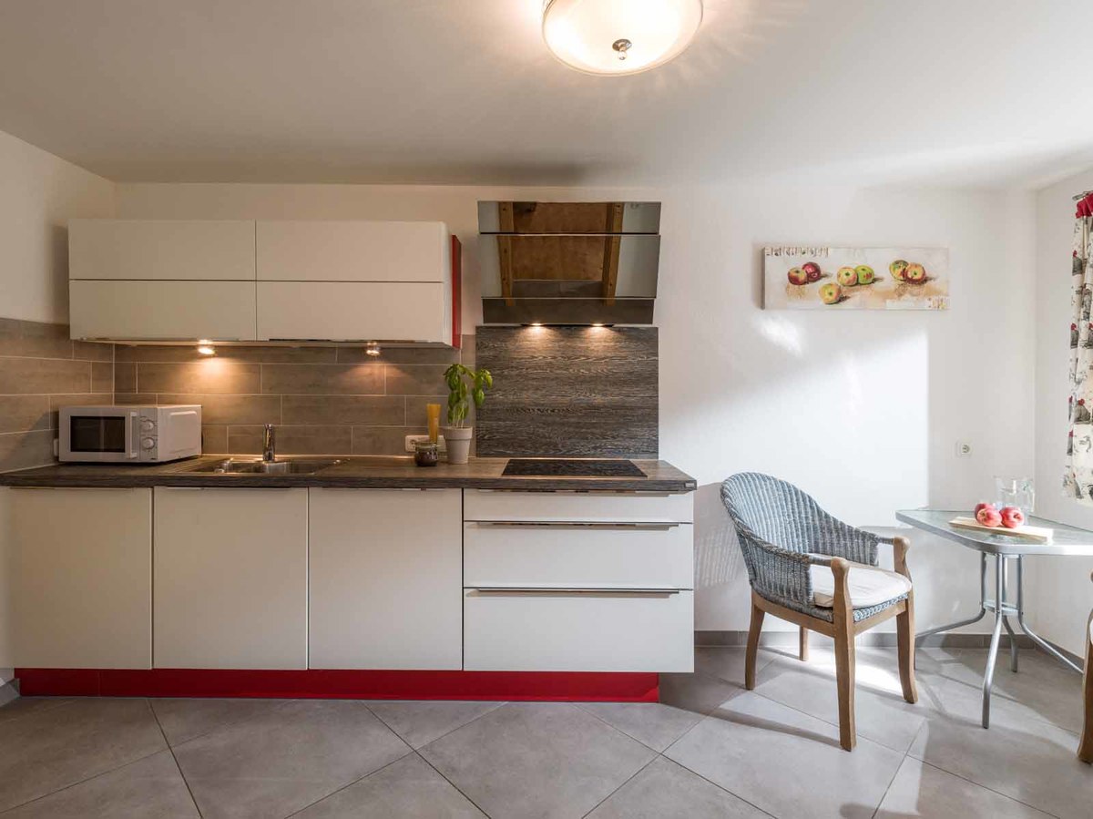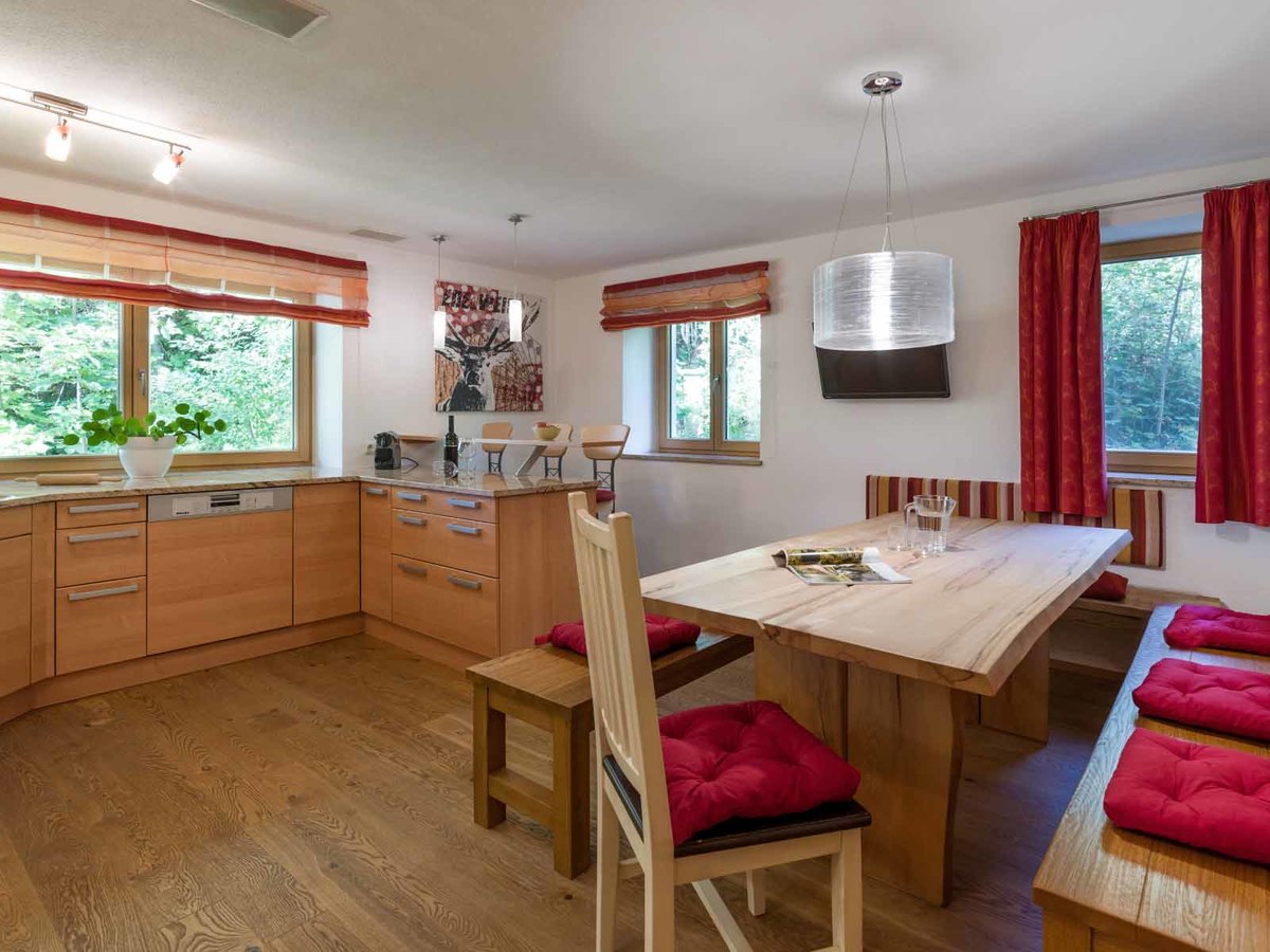 In der voll ausgestatteten Küche mit Steinarbeitsplatte und Küchenbar, Cerankochfeld, Spülmaschine, Kaffee-/ Espressomaschine, Toaster, Teekocher, Backofen, Kühlschrank mit Gefrierfach, Essecke und TV-Gerät kann man gemütliche Abende am großem Familientisch verbringen.