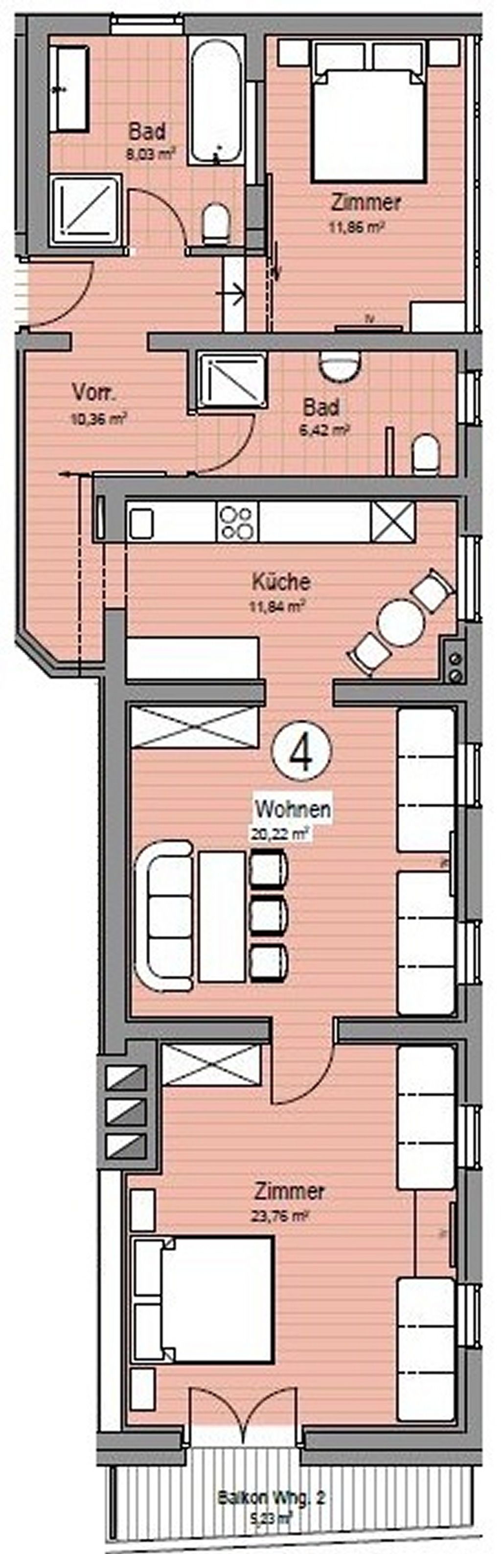 Zusätzlich ist die Wohnung mit einem modernen Badezimmer mit Dusche und WC ausgestattet.