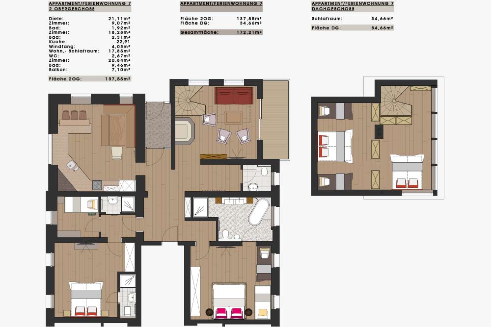 Das Appartement  verfügt über einen großen Wohnbereich mit einem gemütlichen Couchbett für zwei Personen, einen Balkon und Gäste-WC sowie eine geräumige Galerie mit zwei Doppelbetten und zwei Einzelbetten.